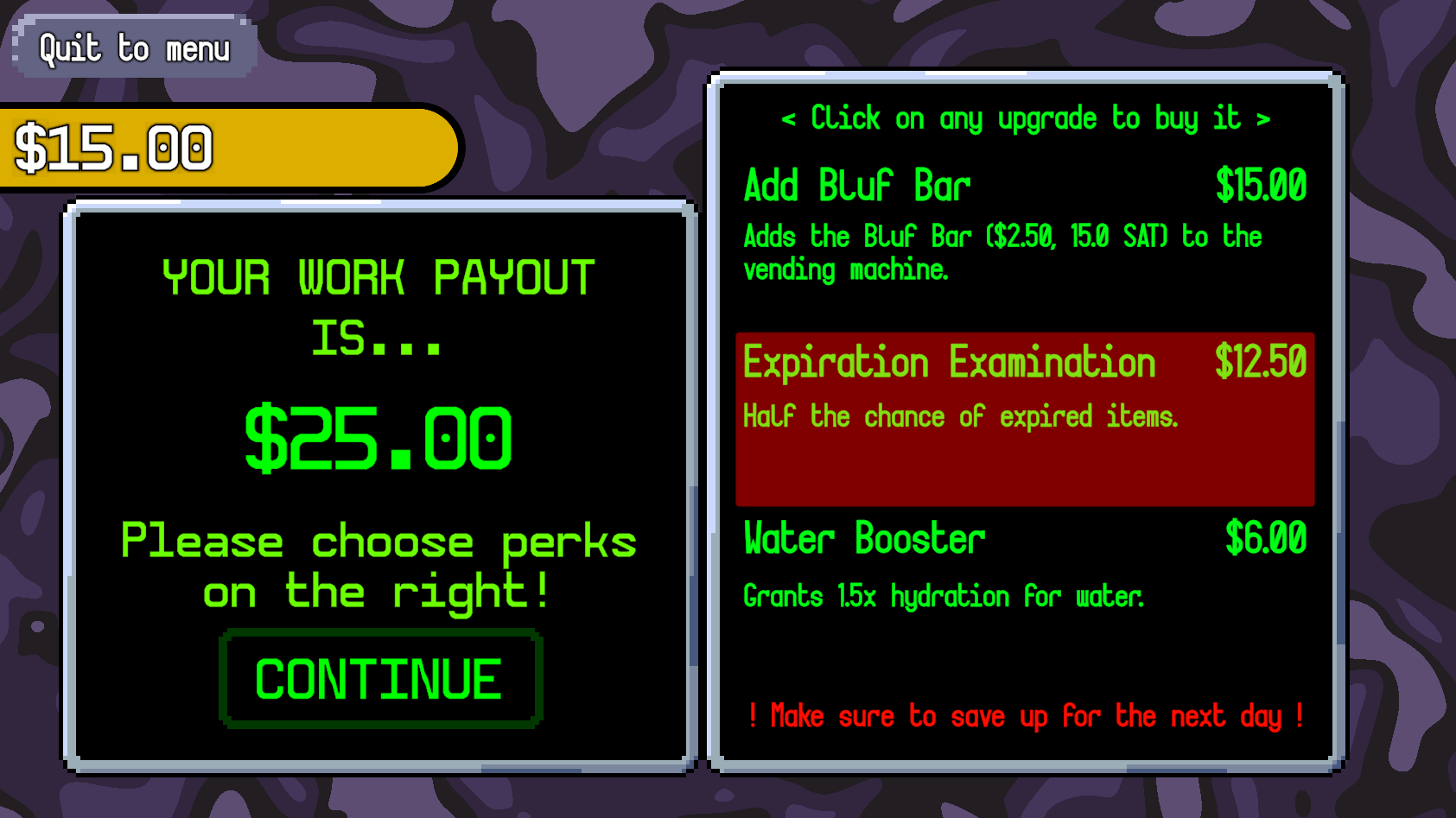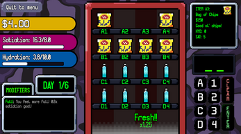 This is a game I made for the 7 Day Roguelike Challenge! It's inspired by my (now ill-advised) love for snacking and drinking stuff you can get from vending machines.